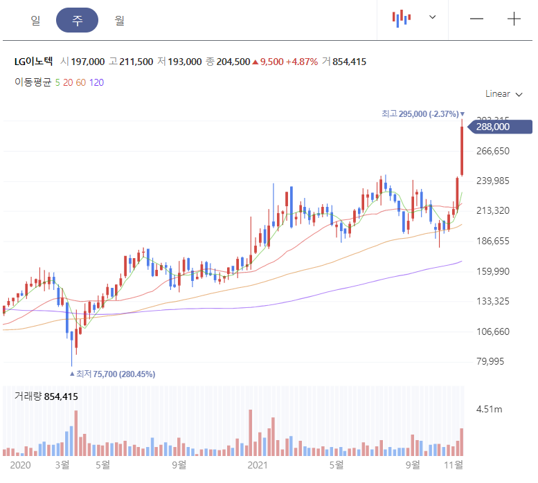 2021년 11월 19일 금요일 종가 기준입니다. 근 한달 동안 시총 7조에 육박하는 종목치고 굉장한 급등을 보여주고 있습니다. 장기적으로 관심두고 있었던 종목인데 이렇게 빨리 신고가에 도달할지는 몰랐네요.