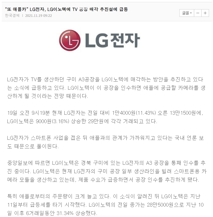 LG전자가 TV를 생산하던 구미 A3공장을 LG이노텍에 매각하는 방안을 추진하고 있다는 소식에 급등하고 있다는 뉴스가 최근에 주목을 받았는데요. LG이노텍이 이 공장을 인수하면 애플에 공급할 카메라를 생산하게 될 것이라는 전망 때문이라고 합니다.
