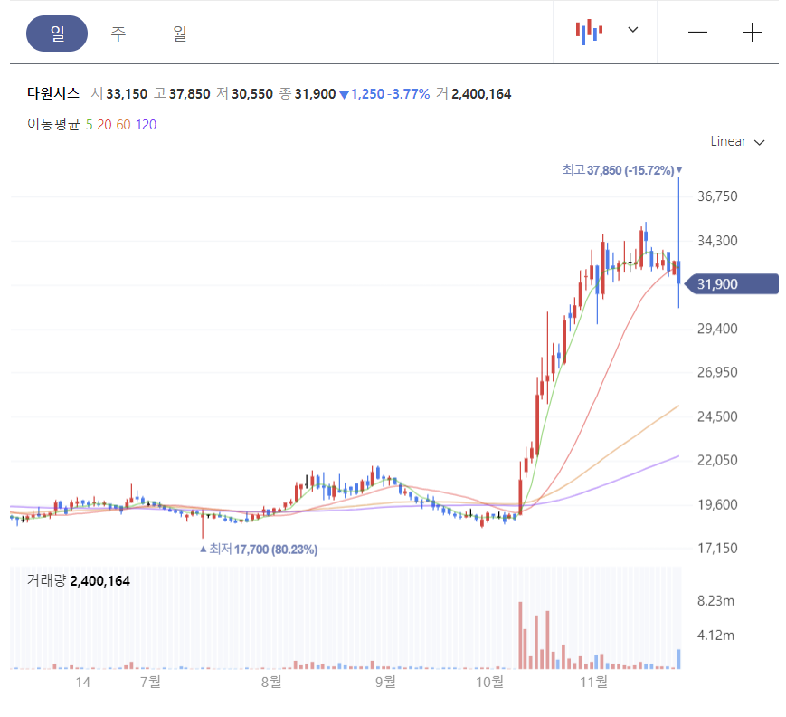 2021년 11월 22일 종가 기준입니다. 장중 뉴스로 인해 10프로 넘게 상승했다가 가라앉고 하락 마감했습니다. 진폭이 20퍼가 넘는 횡보였습니다.