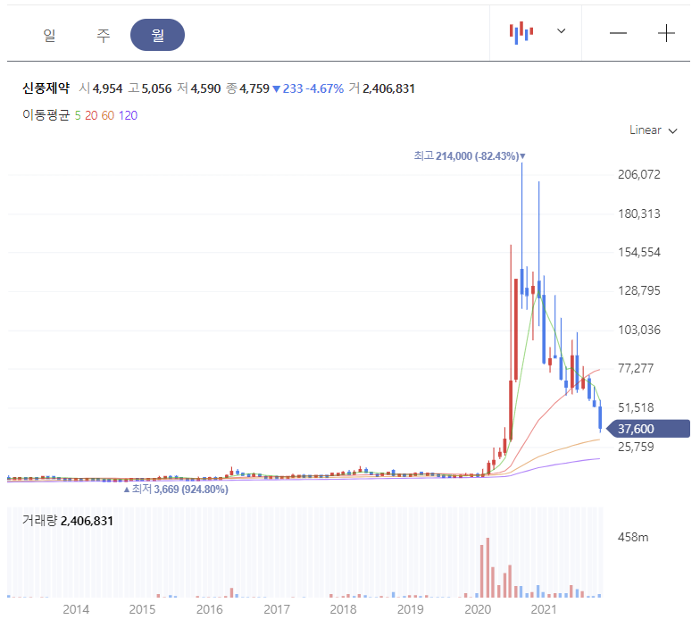 오래된 제약회사이며, 피라맥스로 주목받은 코로나 테마주의 대표격이었던 종목입니다. 확인사살하는 모습이라 마음이 좋진 않네요.