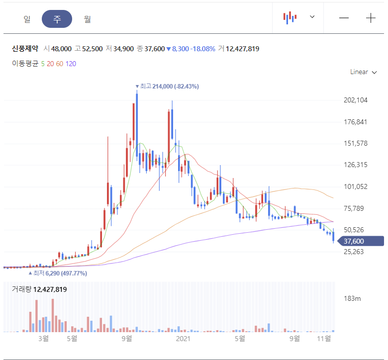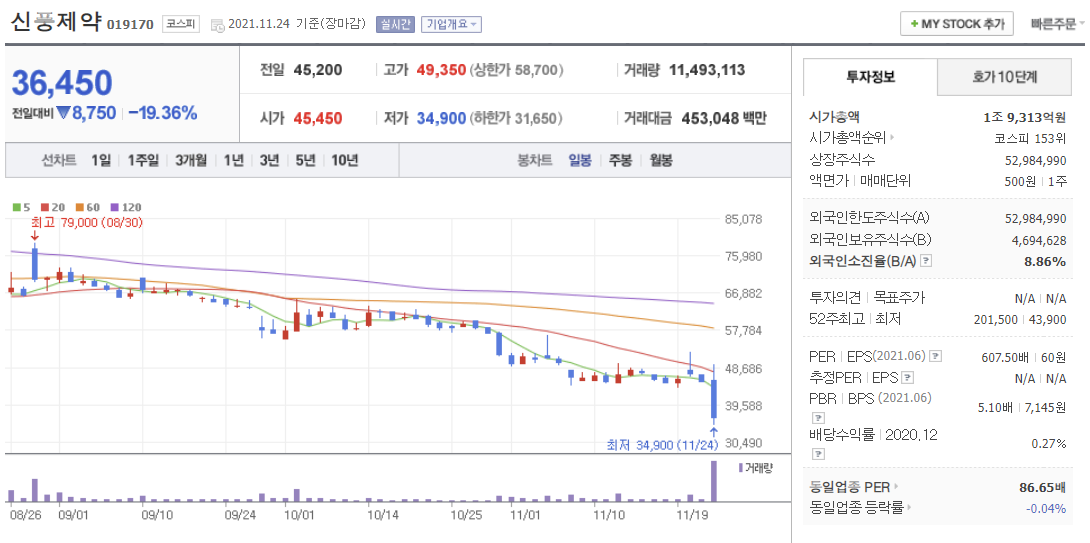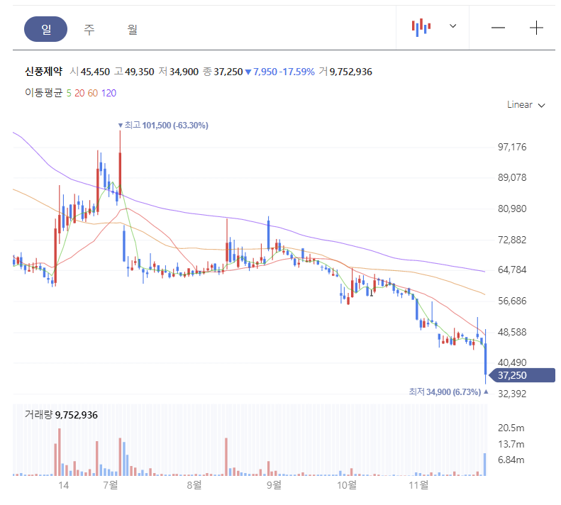 2021년 11월 24일 종가 기준입니다. 계단식 우하향 하던 중에 오늘 악재 뉴스로 인해 -19퍼센트 이상 하락마감하였습니다. 코로나 시절의 대표 주식 중 핫했던 주식인데 오늘 3만원대를 보게되네요. 주식 참...