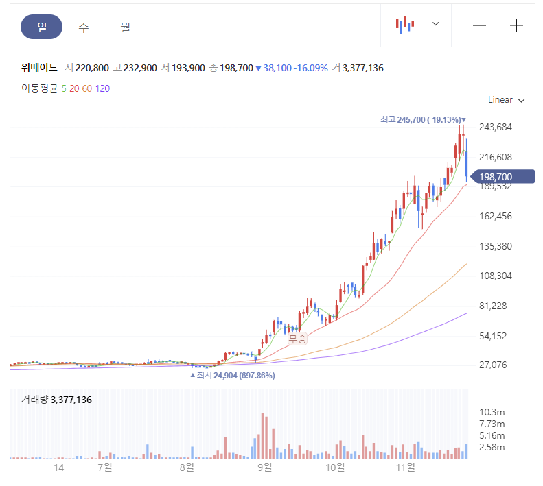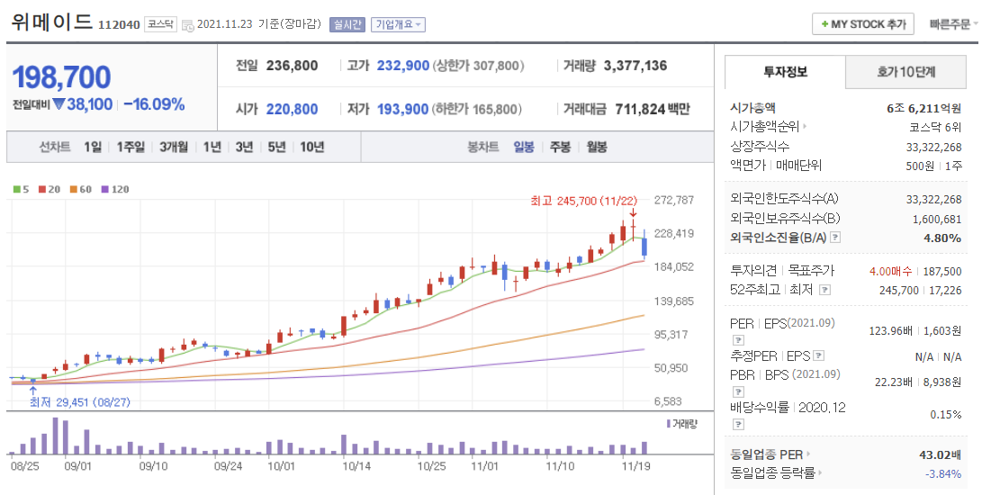 2021년 11월 23일 종가 기준입니다. 드디어 급락 조정이 왔네요. 무섭게 오르는 주가가 한 타임 쉬어가는 모양새네요.