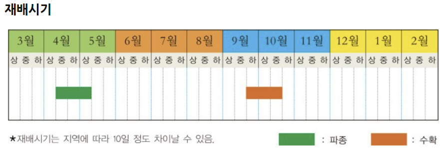 토란은 열대성 식물이라 충분히 날씨가 따뜻해져야 재배 가능하다. 4월 중순 이후에 파종하는 것이 좋다. 남부 지방은 4월 중순, 중부 지방은 4월 말이 파종 적기다. 수확은 서리가 오기 전에 줄기를 먼저 수확하고 알뿌리는 흙을 덮어 두었다 시간이 나면 수확해도 된다. 이는 줄기 수확 후 손질하는 시간이 많이 걸려 알뿌리까지 수확할 시간이 안 될 경우 알뿌리는 수확 후 나온 잎 등으로 덮어놓고 한가할 때 수확하는 방법이다.
