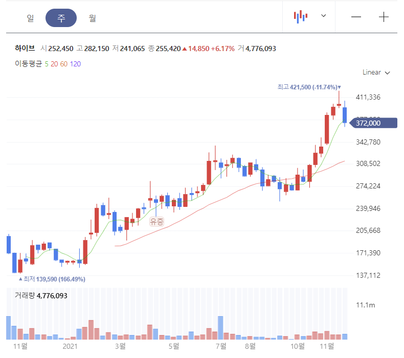 2021년 11월 26일 종가 기준입니다. 국내 Top1 엔터테인먼트 기업입니다. 작년 상장주 중 가장 많은 관심을 받았던 종목이었죠.